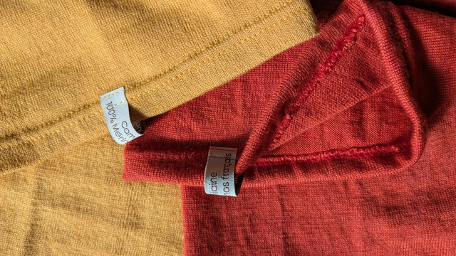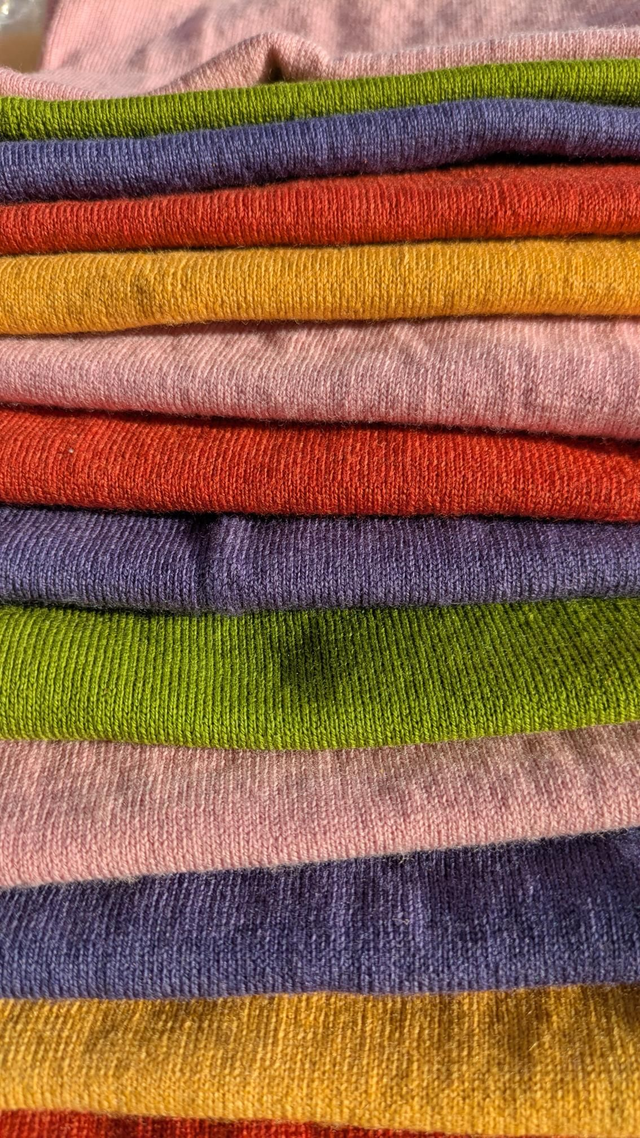 La teinture est faite à partir de plantes : MARRON : brou de noix / ROUGE : racine de garance / ORANGE : fleurs de cosmos / VERT : indigo + gaude / BLEU : feuilles d'indigo / VIOLET : bois de campêche / ROSE : cochenille / BEIGE : écorce de chêne